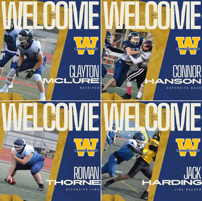 2026 Season March 4, 2026 PLAYER ANNOUNCEMENT The Saint John Wanderers are proud and excited to add these Saint John Falcons to our 2026 roster! Clayton McLure- Receiver Connor Hanson – Defensive Back Roman Thorne – Offensive Line Jack Harding – Linebacker Wanderers vs. Everybody Tags: 2026Rostershare:
